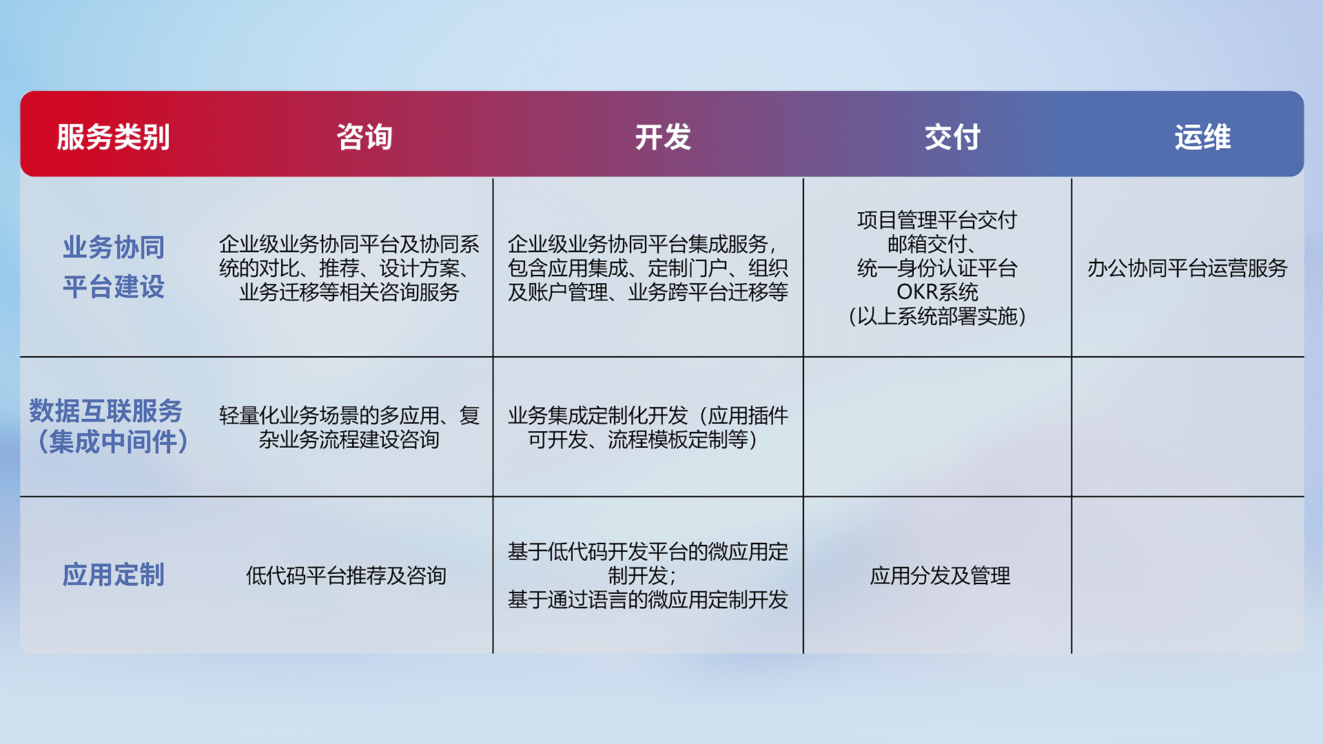 针对钉钉、、企微、、、IDaas等平台级产品提供产品的规划、、、、方案、、、交付、、、、定制化开发等服务,,,实现如统一协同办公、、、智能客户服务、、、、混合会议管理、、、、智能数据查询、、、等业务场景,,,,实现数字化转型。。。